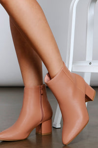Fall in line with cute booties that will have you ready for fall! The booties feature an around the ankle fit, an inner zipper closure, a pointed toe, and a low block heel. The booties are composed of a faux leather material. Complete look with a shacket and jeans.