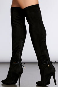 It's all in the little details! This pair of over the knee boots are designed with a flat sole, an inner zipper, a round toe, and a cut out detailing at the top with a small bow detail at the back. Boots are composed of a faux suede.Style Number/Barcode: 07402-0075