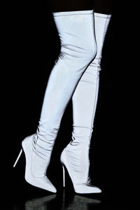 Bring the shine with these shine-worthy beauties! They feature an over the knee fit, a pointed toe and a stiletto heel. Boots are composed of a reflective lycra-like material.