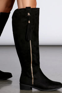 Zip through the cold seasons in style with these flat boots! Boots are over the knee with a full decorative gold side zipper with a tassel, a more discreet full functioning zipper, a short stacked heel and a comfortable faux suede material.Style Number/Barcode: 07402-0047