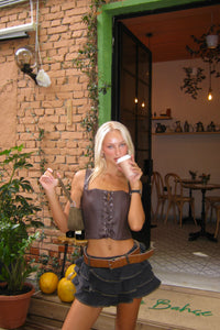 Lace up in this essential mini skirt by Windsor Denim to create some Insta-worthy snaps for the next festival! Pair with boots and fringe and channel those good vibes! The skirt is composed of a denim fabric that offers a form-hugging fit with slight stretch.