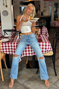 Serve major style in these fabulous straight cropped jeans by Windsor Denim! They feature a flattering high-rise waist, a straight-leg silhouette, knee destruction accents, and a front cut-off style cropped hem. The medium-wash denim fabric offers a moderate stretch for comfortable wear. Complete the look in a cute corset top for a casual dinner!