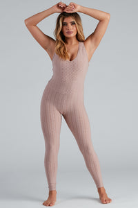 Bend, snap, and work it, girl! This active jumpsuit will keep you looking cute and comfortable in and out of the studio. It features a sleeveless, v-neckline with removable padding, tank-style straps, a criss-cross open back, and a form-fitting silhouette. The textured knit fabric offers a moderate stretch and moisture-wicking. Complete the look in a trendy dad hat.