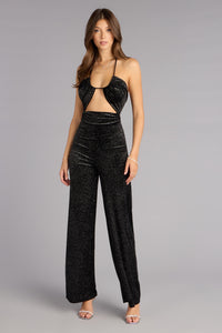 Bring the shine and own the spotlight. This metallic halter jumpsuit serves major glam with a plunging neckline, curve-hugging fit, and flare silhouette. It’s sleek, sparkly, and ready to dance all night.