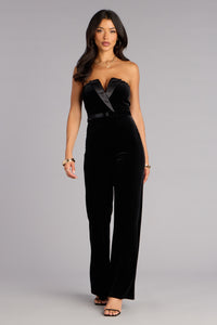 Serve ultra-sleek, ultra-luxe energy in this dreamy velvet jumpsuit. With its sculpted strapless V-plunge neckline and smooth, hip-hugging fit finished with a subtle wide-leg silhouette, this jumpsuit was made for holiday parties, chic dinners, and any dressy affair!