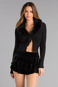 All sparkle, no chill. This faux fur sequin mini skirt mixes cozy and glam with a textured finish and curve-hugging fit made for nights when you want to shine a little brighter.