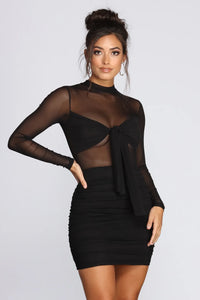 More mesh, the better! Create a striking look with this sleek mini dress! It features a sheer unlined bodice with a mock neck, fitted long sleeves and a tie front accent. Bodice leads to a mini length silhouette with a cascading ruched detailing to hug curves. Dress is composed of a partially lined mesh fabric that offers a moderate stretch.Style Number/Barcode: 05103-0198