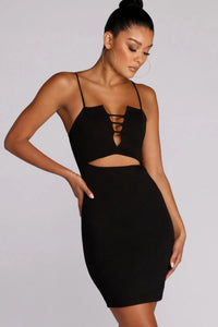 Show them how a lady does it. This sexy little dress features a plunging V neckline with lattice detailing, a midriff cut out giving a two-piece illusion, spaghetti straps, and a stretchy form hugging knit.Model is 5'8" with a 32" bust, 23" waist and 36" hips. She is wearing a size small.
