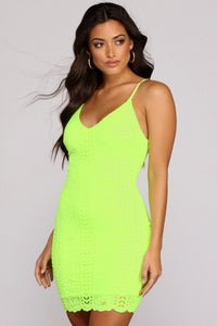 Bring the drama in this hot mini! The dress features a sleeveless bodice, adjustable spaghetti straps, a matching front and back V neckline, a horizontal high waist seam on the back, and a short, scalloped hem. The dress is composed of a sheer crochet lace fabric with a full stretchy knit lining and offers a form hugging fit.