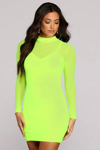 Stand out bby in this head turning mini dress to impress! The dress features a mock neck, unlined stretchy long sleeves, a V neck slip dress composed of a stretchy knit lining and spaghetti straps. Dress is composed of a sheer partially unlined mesh fabric that offers a relaxed fit with a moderate stretch.