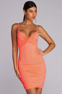 Light up the night with this sultry mini! The dress features a sleeveless bodice, spaghetti straps, a V neckline, ruched detailing with a tie front followed by a front waist cut out, a square back, ruching down each side, and a short, curve hugging fit. The dress is composed of a stretchy knit fabric for comfortable wear.Model is 5'9" with a 34" bust, 24" waist and 34.5" hips. She is wearing a size small