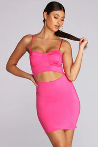 Make a sultry first impression in this sexy satin mini dress! It features a sleeveless bodice, spaghetti straps, a slight sweetheart neckline with padded cups, a front waist cut out, and a short, curve hugging fit. The dress is composed of a satin-like fabric that offers moderate stretch.