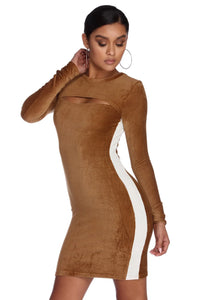 Warm weather is winding down, so bring in this warm gold mini dress! It features a high neckline, long fitted sleeves, a cut out above the bust for a sexy peek of skin, and contrasting white stripes on the sides for a slimming illusion. Dress is composed of a dense corduroy fabric that offers a moderate stretch.
