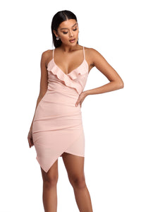 You'll be ready for some brunch or afternoon tea in this classy ruffle dress! It features a deep V neckline with a flirty ruffle trim, spaghetti straps, and large pleats on one side to accentuate your curves. Dress offers a slim fit and is composed of a crepe fabric with a moderate stretch.Model is 5'8" with a 32 bust, 23 waist and 36" hips. She is wearing a size small.