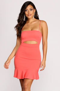 Get ready to raise the temps in this striking abstract mini dress! The side cutout and hoop insert create a stunning look along the bodycon silhouette while the ruffled trim slit adds a sultry touch.