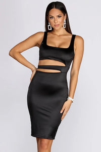Take control of the room in a midi dress that says it all! Featuring a square neckline, spaghetti straps, and a curve hugging fit. Dress is one piece, with a cut out detail below the chest. Skirt of the dress features a high slit at one side and a hem that hits right above the knee.