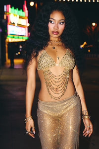 Headline the show in this beaded triangle bralette to make a statement at festivals and concerts! Style with edgy denim shorts for a cool look.