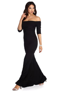 Special OccasionGet ruched and ready to make a breathtaking impression in our Stella dress! She features an all over black hue, an off the shoulder neckline, ruched long sleeves and ruching along the sides to create a cascading-like effect that leads to a floor length silhouette. Dress is composed of a black hued lined smooth knit fabric that offers a curve hugging fit with a moderate stretch. Includes a back zipper closure.