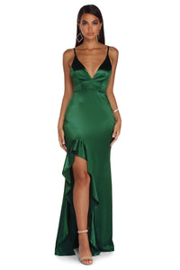 Special OccasionRaise a commotion in ruffles as you charm in our mesmerizing Leah dress! She features a sleeveless bodice, a plunging V neckline with narrow adjustable straps and princess seams. Her slim fit bodice leads to a flaring high low hemline with a flirty ruffle trim. Dress is composed of a emerald green hued stretchy satin fabric that offers a form hugging fit to highlight curves. Garment is lined with a smooth knit fabric and includes back zipper closure.