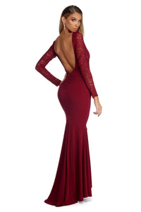 Special OccasionMake an alluring entrance in lace! Our Laila dress features a rich burgundy hue, a round neckline, fitted unlined lace long sleeves, lace insets at the waist to create an hour glass illusion and an elongating floor length silhouette that is accented with a high side slit. Her back features a bold open back that leads to a lower back zipper closure with ruched detailing. Dress is composed of a combination lace and crepe fabric that offers a form hugging fit with a moderate stretch. Includes a full knit lining.