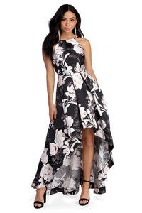 Special OccasionBurst onto the scene with fresh florals as you make a sweet impression in our Camilla dress! She features an all over black hue, a square neckline with racer bust, narrow adjustable straps and princess seams. Her slim fit bodice leads to pleated high-low silhouette that is accented with hidden side pockets. Dress is composed of textured satin fabric that is adorned with a blush hued printed floral design. Garment offers a relaxed fit with minimal stretch. Lined with a smooth knit fabric and includes a petticoat.