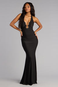 Bold, sculpted, and made for the spotlight — the Zaria formal gown turns every entrance into a slow-motion moment. Crafted in smooth stretch knit with a dramatic plunging halter neckline framed by metallic hardware, this gown cinches with soft ruching and finishes in a sleek mermaid silhouette.