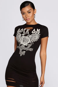 Hey, wild child! Show off your spirited side in this distressed tunic top (or be bold and make it a mini!). Top features a crew neck, short sleeves, shredded V detail at chest and hem, and a large "Rock On" contrast graphic. Top is cut for a slim fit and made from an ultra-soft rayon knit with moderate stretch.Style Number/Barcode: 06002-0188
