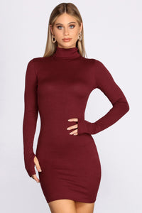 Get a simply perfect 'fit with this basic knit mini dress! With its fitted long sleeves and curve-hugging silhouette, this stretchy knit dress is oh-so-flattering. A definite for your next date night, keep it casual with a pair of chunky sneakers or glam it up with some bold block heels.