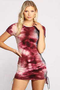 You'll look like such a dream in this trendy tie dye mini dress! It features ruched detailing with side ties and a form-fitting style that will hug your curves. Pair this dress with some sleek gold hoops and chunky sneakers for that perf everyday vibe.