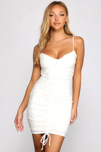 Show off your stunning style this summer in this gorg mini dress! It features a sleeveless sweetheart neckline with a ruffled trim, spaghetti straps, center ruching with a drawstring at the hem, and a mini-length, curve-hugging silhouette. Complete the outfit with cute wedges for the perfect graduation look.