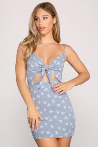 Get lovestruck with this pretty butterfly print mini dress that brings the charm! The mini dress features a sleeveless sweetheart neckline with a cute tie-front accent, a cutout at the midriff, adjustable spaghetti straps, a smocked back, and a mini-length silhouette. The dress is composed of a gauze knit fabric that offers a relaxed fit with minimal stretch. Complete look with mules!