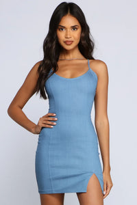 We dare you to strut your style in this dress! The dress features a sleeveless scoop neckline, corset seams at the bust, adjustable spaghetti straps, and a mini-length silhouette. The dress is composed of a denim fabric that offers a form hugging fit with a moderate stretch. Complete look with mules and hoops.
