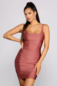 Bring those sleek and stunning vibes to your girl's night out in this ruched knit mini dress! It features a sleeveless bodice, tank-like shoulder straps, a scoop neck and back, ruched detailing, and a short, curve-hugging silhouette. The lined knit fabric has plenty of stretch for comfortable wear. Complete your outfit with strappy heels and new accessories to glam up your look.