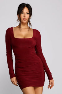 Keep it sultry in a dress that showcases curves in all the right places! The dress features a square neckline, ruched long sleeves, and mini length silhouette. Complete your look with clear mules and hoops for the perfect night out look.
