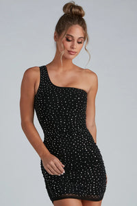 Sparkle and shine in this gorgeous rhinestone mesh mini dress! It features a sleeveless one-shoulder neckline, a tank shoulder strap, ruched detailing, a mini-length, curve-hugging silhouette, and all-over rhinestone embellishment. Style this dress with sexy stiletto heels and a chic clutch.