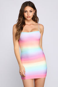 Brighten your look with a rainbow mini dress that commands attention! The dress features a sleeveless square neckline, bungee spaghetti straps, a rainbow tie-dye hue, and a mini-length silhouette. The dress is composed of a lined mesh fabric that offers a form hugging fit with a moderate stretch. Complete look with mules.