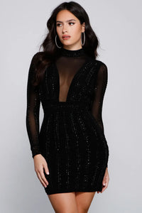 Elevate your night-out look with the sultry Amelia mini bodycon dress! She features a mock neckline, sheer long fitted sleeves, an illusion bodice with a sheer deep V-insert at the bust, a high waist, and a mini-length, curve-hugging silhouette. The formal short dress is composed of a sheer mesh fabric that includes a skirt lining and chic rhinestone detailing. Complete the outfit with clear heels.
