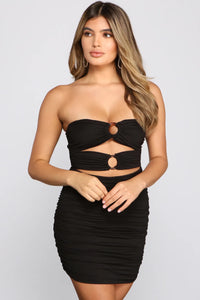 Head out tonight with a mini dress that will have you ready to hit the scene! The dress features a sleeveless square neckline, piping seams at the bodice, bungee spaghetti straps, a ruched body, and a mini-length silhouette. The dress is composed of a smooth knit fabric that offers a form hugging fit with a moderate stretch. Complete look with heels.