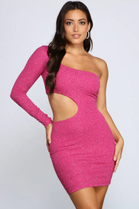 Stun like the A-lister you are with a mini dress that brings the shine to your night out! The dress features a one-shoulder neckline, a fitted long sleeve, a sexy waist cutout, and a mini-length silhouette. The dress is composed of a glitter knit fabric that offers a form hugging fit with a moderate stretch. Complete look with heels and statement earrings.