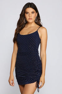 Get ready to glow in this chic bodycon for your next night out! Effie features a sleeveless scoop neckline, adjustable spaghetti straps, sparkling heat stones throughout, dual ruched drawstrings, and a mini-length silhouette. Complete look with rhinestone heels.
