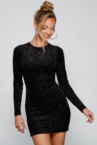 Chic and elevated, this mini dress is a must-have for date nights. It features a crew neckline, long sheer fitted sleeves, and a short, curve-hugging silhouette. The sheer knit fabric has a lining and an all-over vintage-inspired velvet burnout pattern. Style this dress with a sleek clutch.