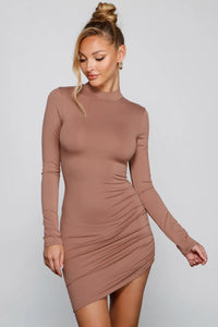 This mini dress is sure to be a hit for your closet! It features long fitted sleeves, a mock neck, and a side shirring detail that shapes the high-low short hem. The brushed knit fabric offers a moderate stretch. Style with an oversized jacket.