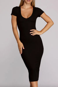 Get a total casual chic vibe with this adorable daytime LBD! It features a V neckline, short sleeves, and a mid-length, curve hugging fit. The dress is composed of a ribbed knit fabric that offers plenty of stretch.