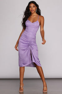 Chic and fab, the Katelyn ruched midi dress is a new go-to. She features a sleeveless bodice, a Y neck with halter straps, a knot detail, and a front keyhole cut out, and a square back with a zipper closure. Her high waist band leads to a curve hugging skirt with ruched side details and a mid-length hem. The dress is composed of a stretchy knit fabric with a pretty sheen.