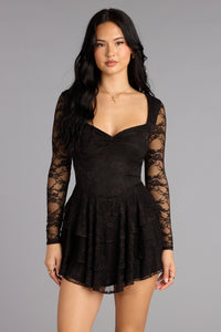 Romance with a little edge—this lace skater dress is pure drama in the best way. Sheer long sleeves and a flirty A-line fit keep it chic and playful, ready for any RSVP.