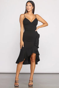 Bring the flair in this ruffled dress for your next night out! The dress features a plunging V-neckline and a ruffled asymmetrical hem. The dress is composed of a form-hugging crepe fabric that embraces curves while providing a retention stretch. Complete your look with sleek heels and rhinestone earrings.