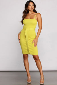 Keep it chic in a belted dress that elevates you to a sophisticated and polished look. The dress features a sleeveless square neckline, spaghetti straps, side slit, and a belted waist with a rectangular buckle. Complete look with clear heels.