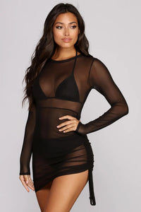 Stir up the scene in this must have mesh cover-up. It features a round neckline, long sleeves, a drawstring side and a mini length. Mesh fabric is sheer and unlined.Model is 5'9" with a 33" bust, a 24" waist, and 35.5" hips. She is wearing a size small.