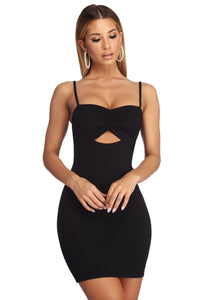Get those sultry styles with this sleek and chic mini dress! It features a sleeveless bodice, adjustable spaghetti straps, a sweetheart neckline, ruched detailing at the bust with a cut out below, a back zipper closure, and a short, form hugging fit. The LBD is composed of a knit fabric that offers moderate stretch.