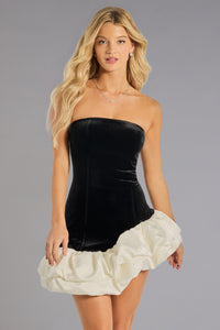 Bring the flirtatious allure in the Addie velvet ruffled mini dress perfect for your next party! The short formal dress is designed with a strapless straight-across neckline, vertical seams that run from bust to hem, and a tiered, ruffled, asymmetric hem for that dramatic flair.